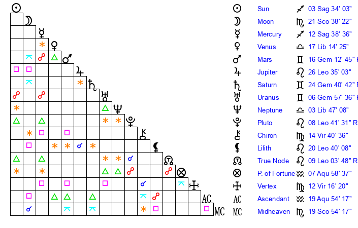 | Moon | 21 Scorpio 35 | 15 Aquarius 58 | 19 Scorpio 33 |