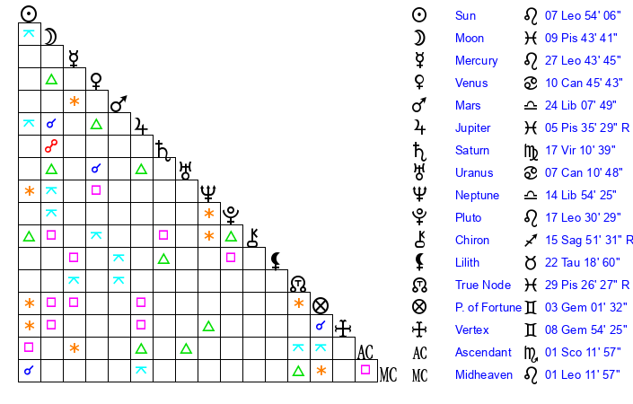 | Sun | 7 Leo 54 | 8 Leo 44 | 20 Libra 46 |