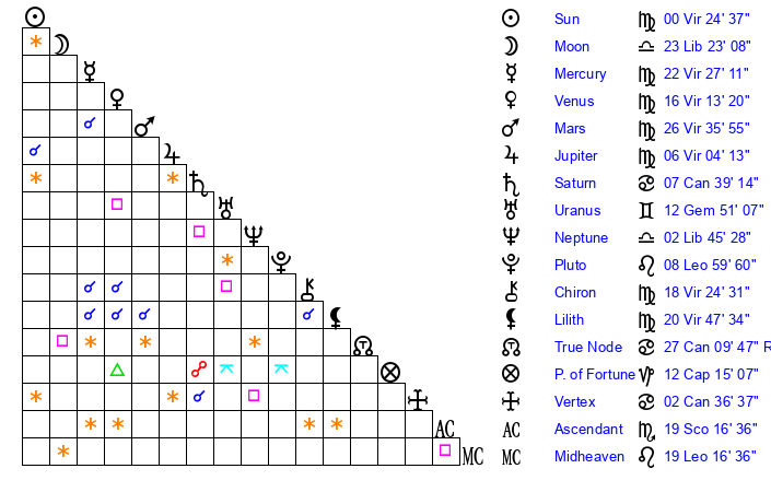 | Moon | 23 Libra 25 | 6 Virgo 7 | 14 Libra 1 |