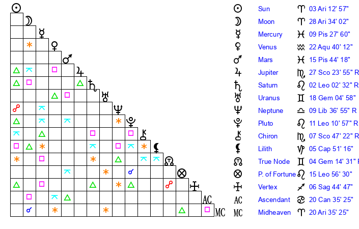 | Sun | 3 Aries 13 | 4 Aries 18 | 18 Gemini 58 |