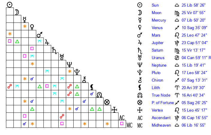 | Sun | 25 Libra 59 | 26 Libra 34 | 12 Capricorn 46 |