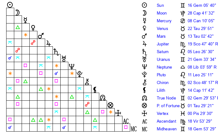 | Jupiter | 19 Scorpio 39 | 29 Gemini 31 | 19 Scorpio 52 |