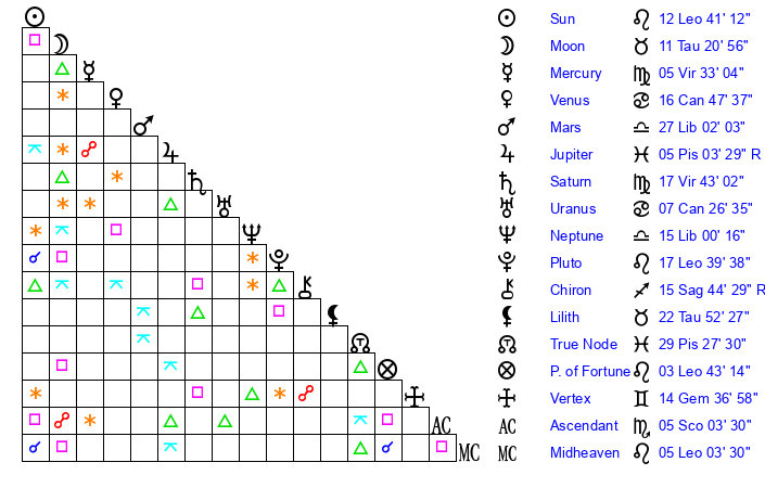 | Moon | 11 Taurus 21 | 29 Sagittarius 56 | 14 Aquarius 50 |