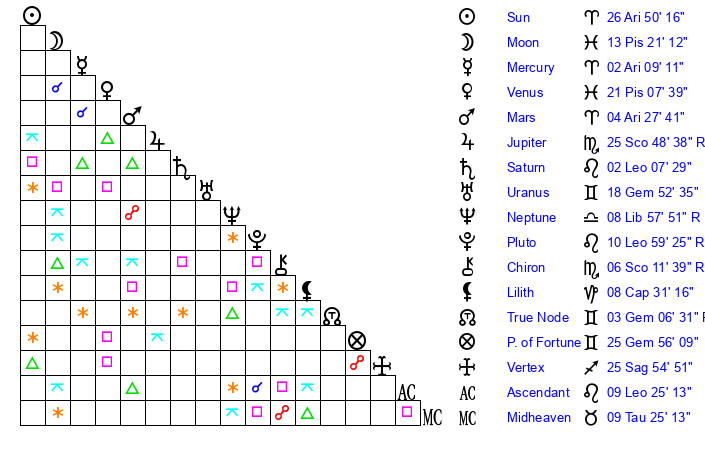 | Saturn | 2 Leo 34 | 26 Pisces 21 | 8 Leo 50 |