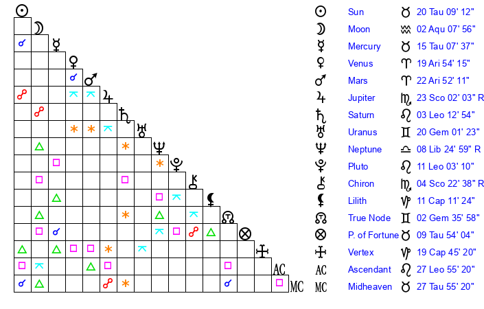 | Sun | 20 Taurus 9 | 21 Taurus 15 | 4 Leo 46 |