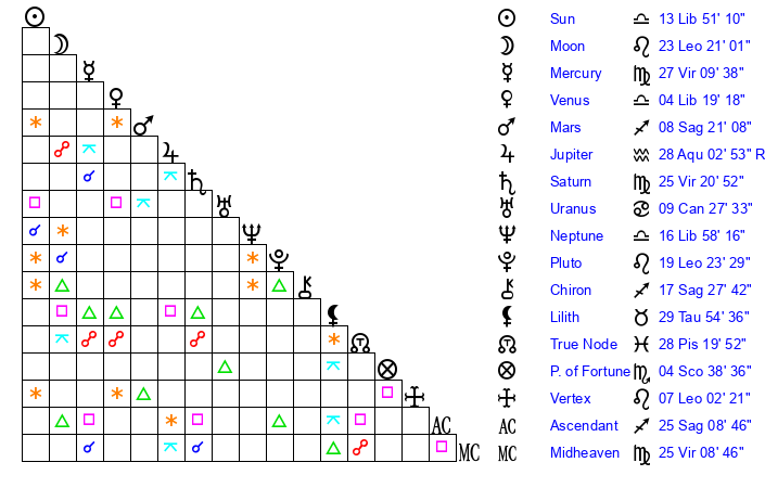 | Saturn | 25 Virgo 49 | 27 Pisces 9 | 2 Libra 27 |
