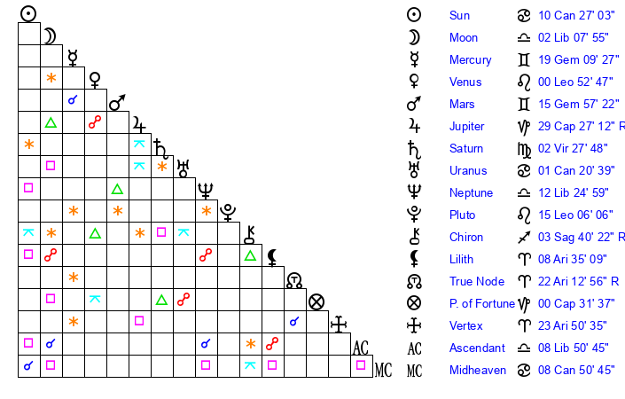 | Moon | 2 Libra 10 | 9 Libra 59 | 6 Cancer 22 |