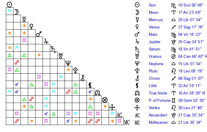 | Sun | 10 Scorpio 57 | 11 Scorpio 31 | 28 Capricorn 3 |
