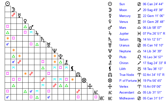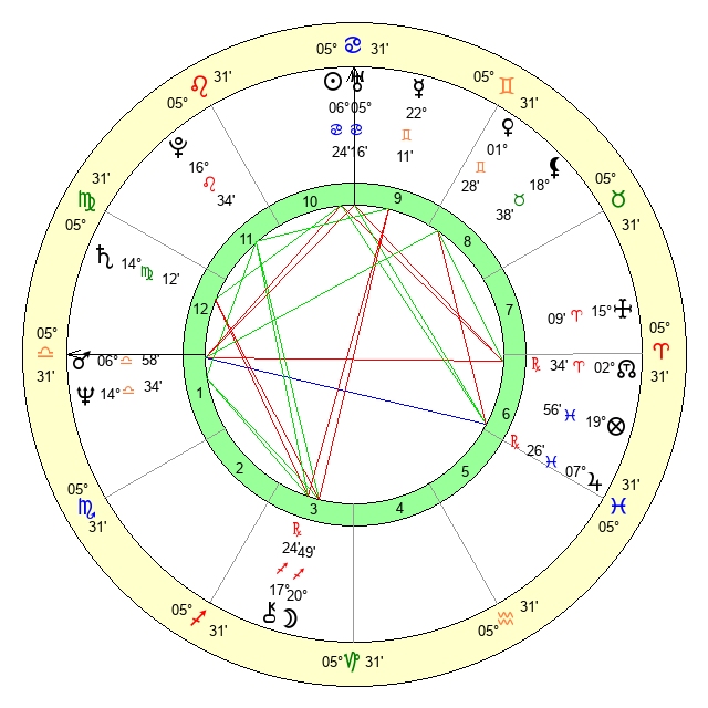 | Sun | 6 Cancer 24 | 7 Cancer 15 | 18 Virgo 22 |