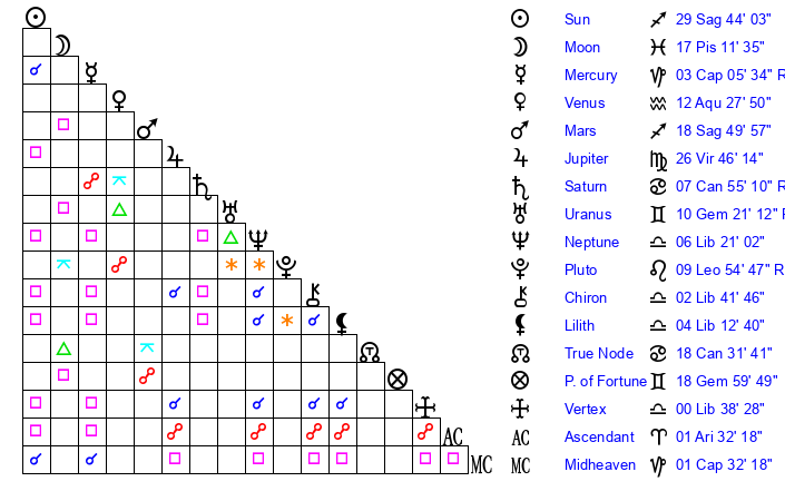 | Neptune | 6 Libra 22 | 29 Pisces 24 | 5 Libra 26 |