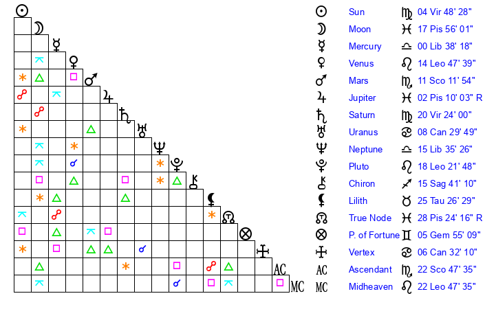 | Moon | 17 Pisces 50 | 7 Scorpio 46 | 13 Sagittarius 15 |