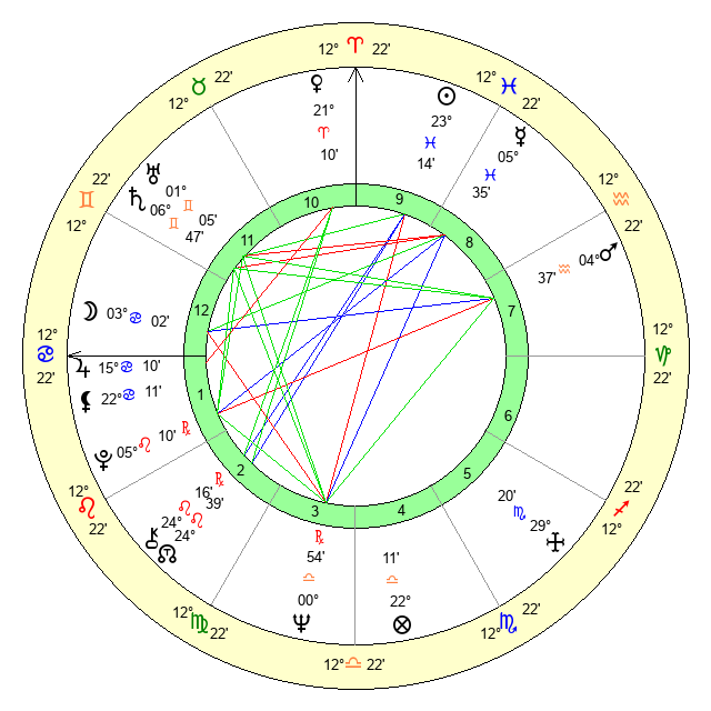 | Moon | 3 Cancer 4 | 28 Virgo 52 | 3 Cancer 3 |