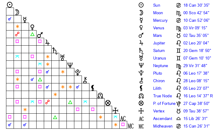 | Moon | 0 Scorpio 34 | 29 Capricorn 53 | 3 Scorpio 48 |