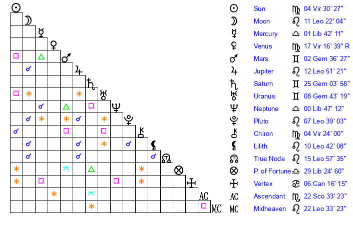 | Venus | 17 Virgo 16 | 3 Leo 36 | 8 Libra 51 |