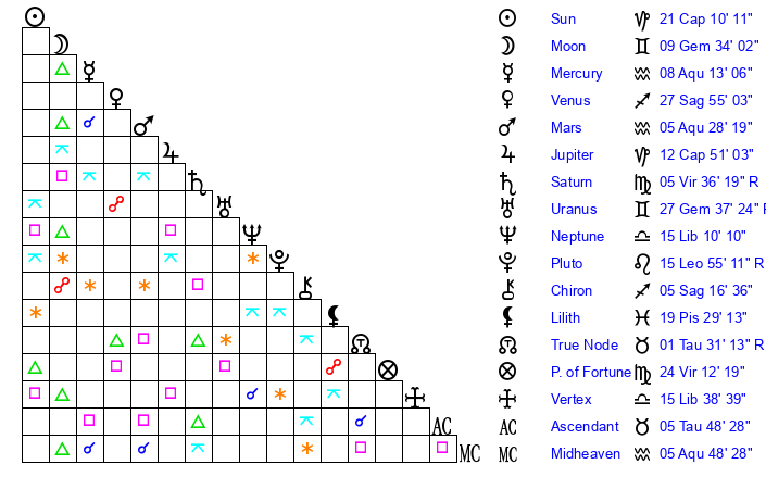 | Neptune | 15 Libra 10 | 29 Pisces 40 | 13 Libra 56 |