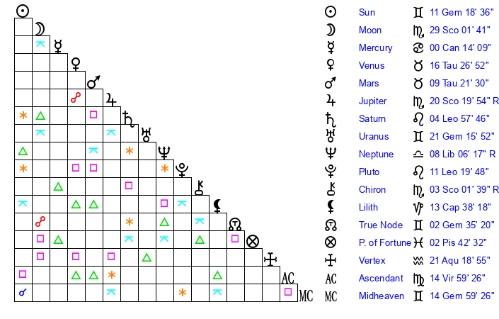 | Jupiter | 20 Scorpio 11 | 28 Gemini 23 | 19 Scorpio 20 |