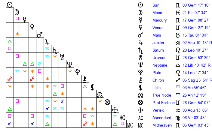 | Sun | 0 Gemini 17 | 0 Gemini 53 | 12 Leo 55 |