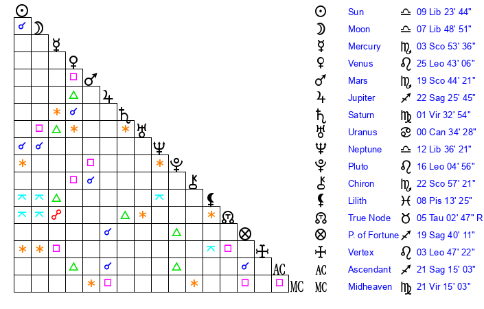| Neptune | 12 Libra 36 | 0 Aries 29 | 14 Libra 56 |