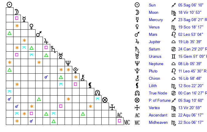 | Sun | 5 Sagittarius 6 | 5 Sagittarius 42 | 26 Aquarius 25 |