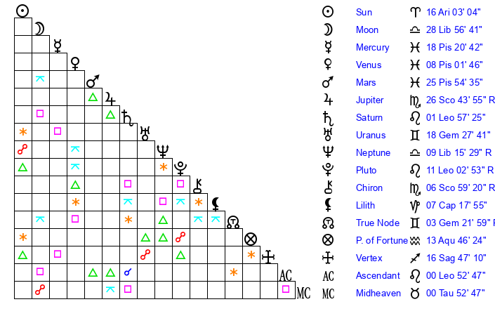 | Neptune | 9 Libra 15 | 0 Aries 16 | 8 Libra 2 |