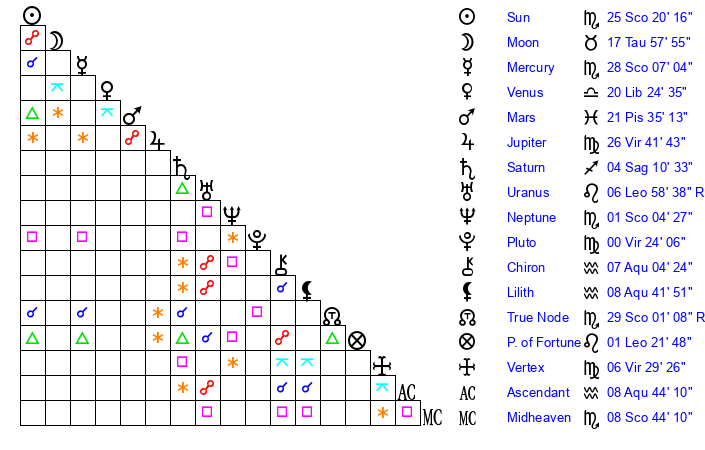 | Pluto | 0 Virgo 23 | 1 Aquarius 38 | 29 Leo 45 |