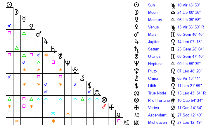 | Sun | 10 Virgo 19 | 11 Virgo 27 | 1 Sagittarius 33 |