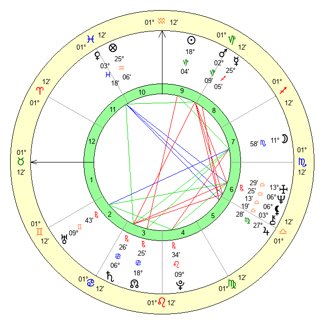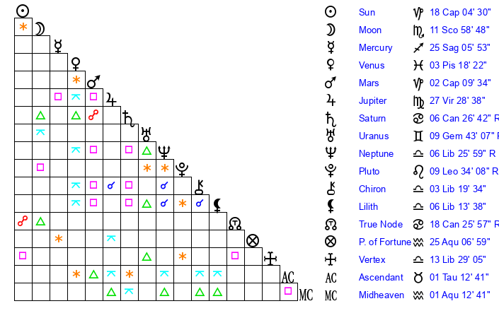 | Neptune | 6 Libra 26 | 27 Pisces 25 | 4 Libra 58 |
