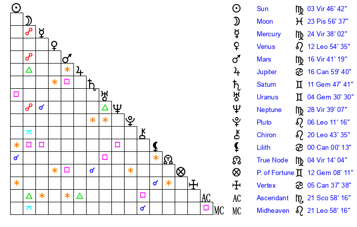 | Moon | 23 Pisces 54 | 25 Libra 50 | 7 Aries 47 |
