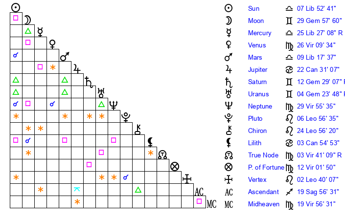 | Venus | 26 Virgo 10 | 14 Virgo 56 | 10 Capricorn 17 |