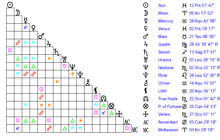 | Sun | 12 Pisces 51 | 13 Pisces 22 | 19 Taurus 45 |