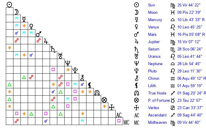 | Moon | 9 Pisces 27 | 19 Leo 25 | 25 Virgo 48 |