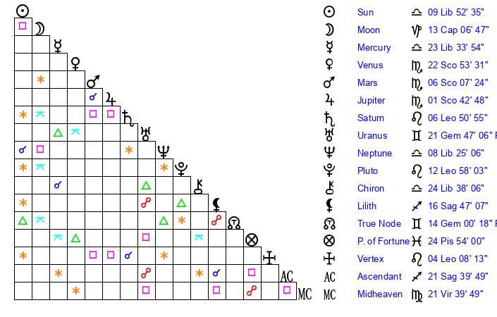 | Sun | 9 Libra 53 | 10 Libra 44 | 29 Sagittarius 14 |