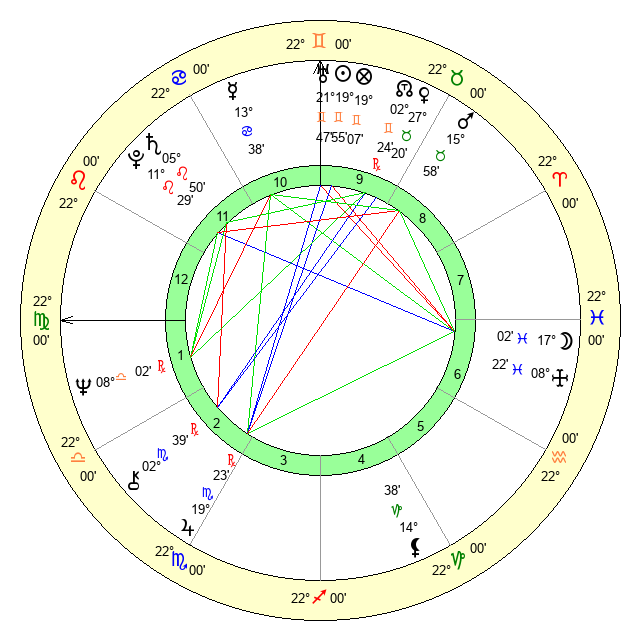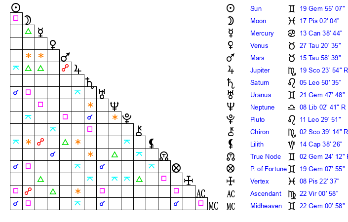 | Sun | 19 Gemini 55 | 21 Gemini 1 | 4 Virgo 32 |
