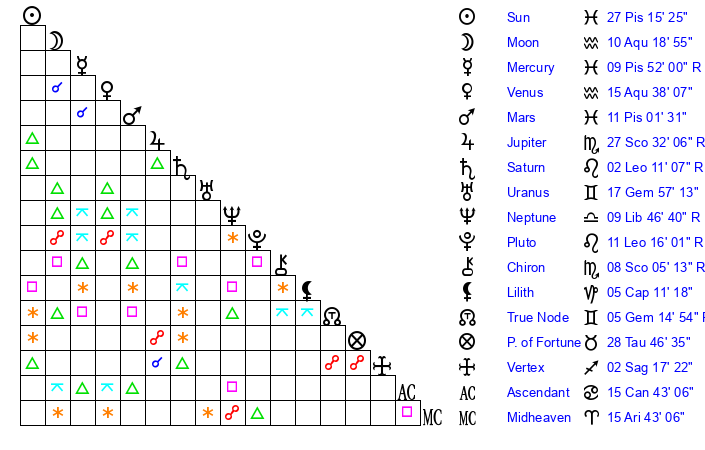 | Sun | 27 Pisces 15 | 28 Pisces 21 | 13 Gemini 13 |