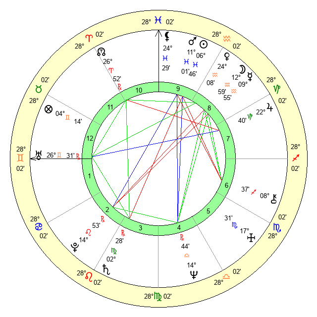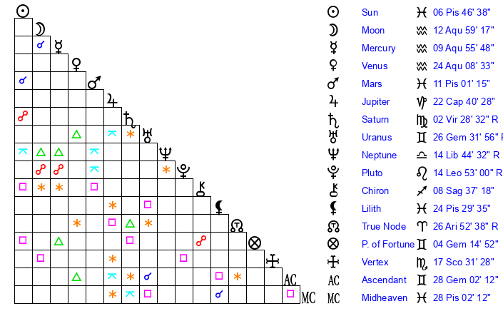 | Moon | 12 Aquarius 52 | 6 Aquarius 26 | 24 Scorpio 2 |