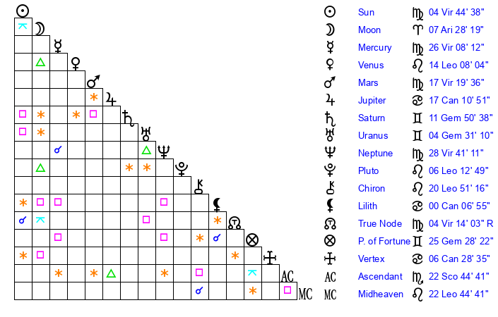 | Moon | 7 Aries 28 | 7 Scorpio 46 | 20 Aries 36 |