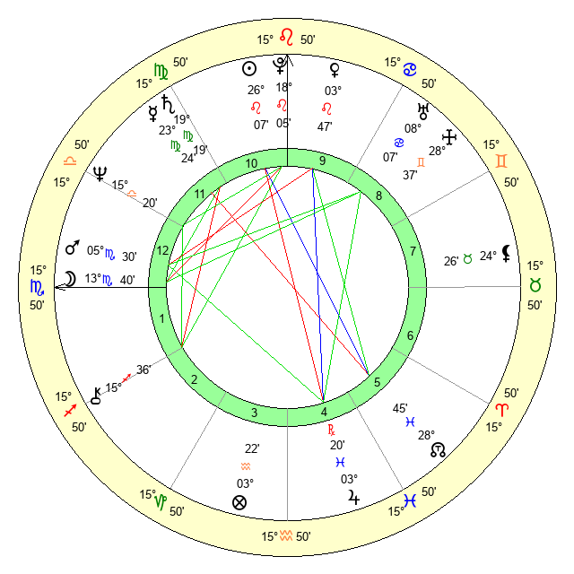 | Moon | 13 Scorpio 38 | 12 Cancer 33 | 5 Leo 49 |