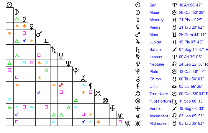 | Moon | 26 Cancer 56 | 13 Virgo 48 | 17 Aquarius 46 |