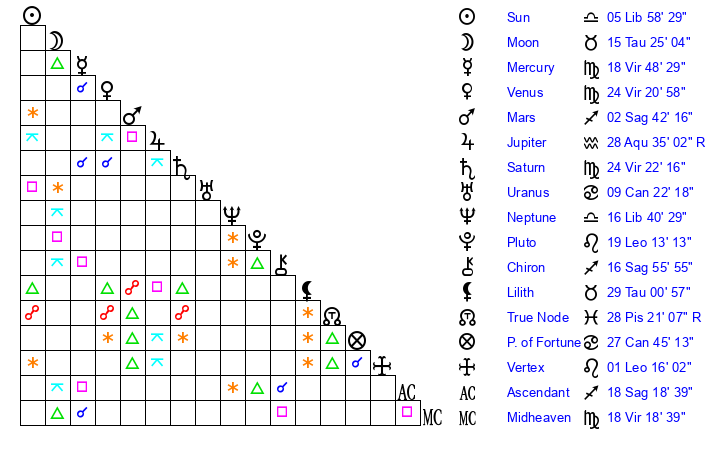 | Neptune | 16 Libra 40 | 0 Aries 34 | 19 Libra 7 |