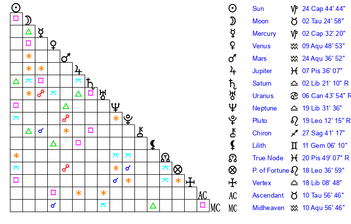 | Moon | 2 Taurus 25 | 20 Sagittarius 30 | 29 Capricorn 25 |