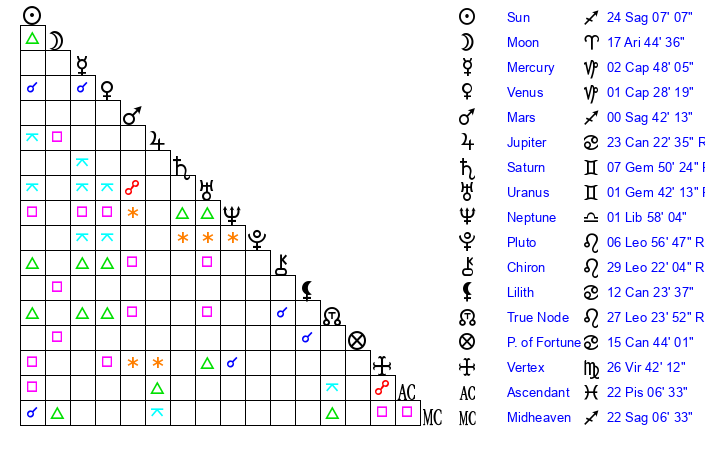 | Sun | 24 Sagittarius 7 | 24 Sagittarius 59 | 18 Pisces 15 |
