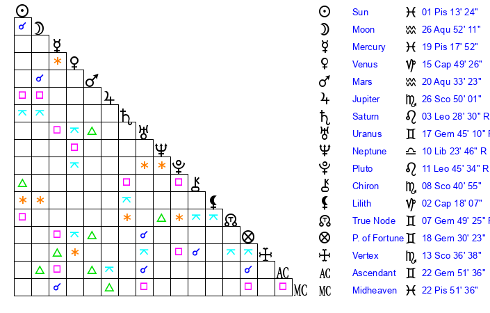 | Neptune | 10 Libra 23 | 28 Pisces 35 | 8 Libra 27 |
