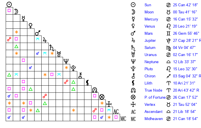 | Sun | 25 Cancer 43 | 26 Cancer 19 | 9 Libra 10 |