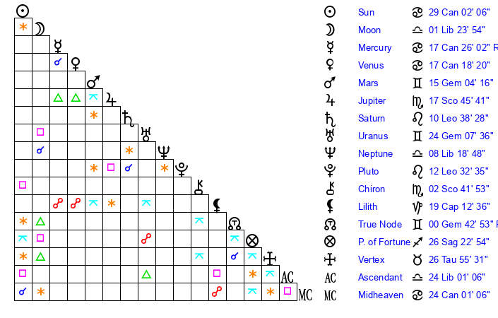 | Venus | 17 Cancer 19 | 20 Gemini 17 | 23 Libra 56 |