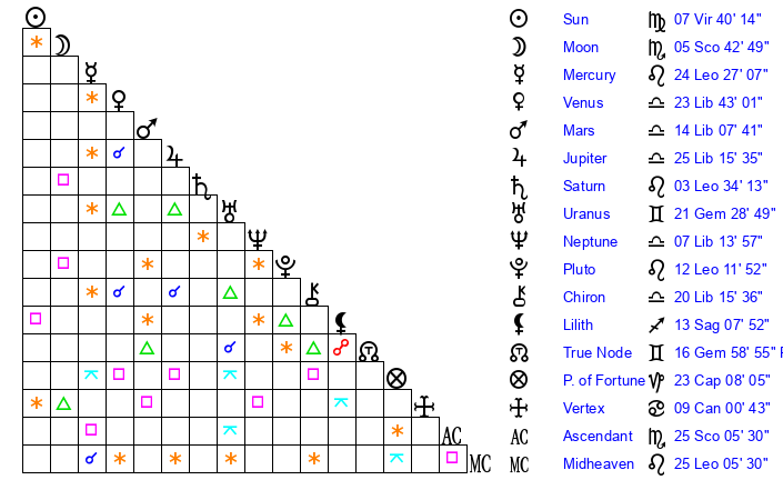 | Sun | 7 Virgo 40 | 8 Virgo 32 | 25 Scorpio 46 |
