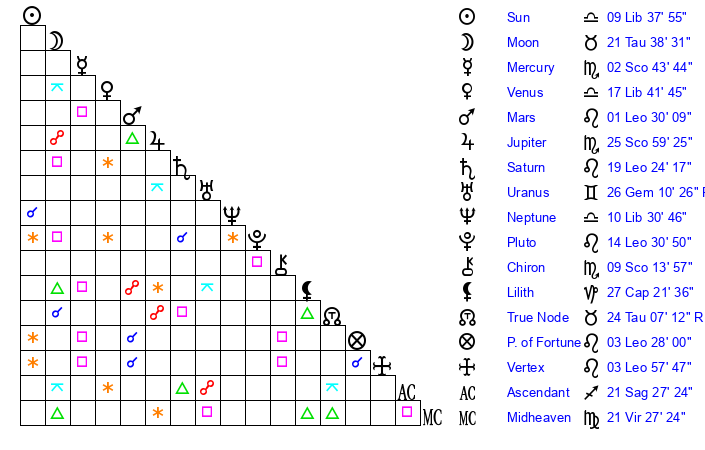 | Moon | 21 Taurus 35 | 24 Aquarius 48 | 27 Pisces 38 |