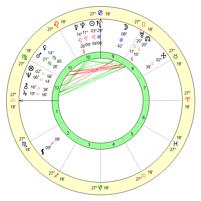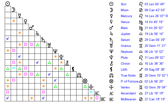 | Mercury | 14 Leo 26 | 12 Leo 45 | 8 Scorpio 34 |
