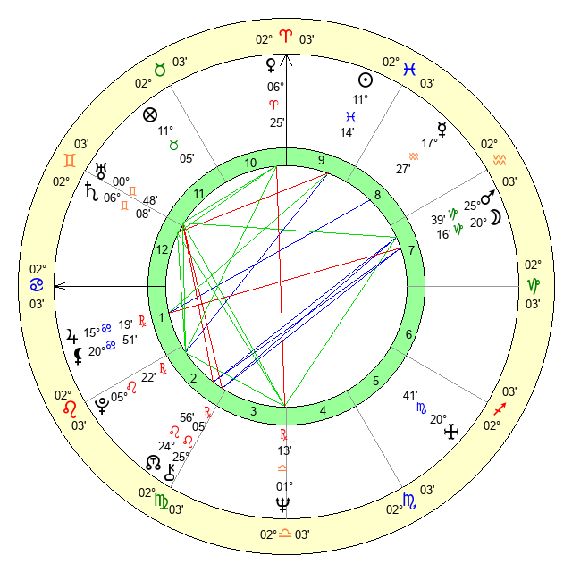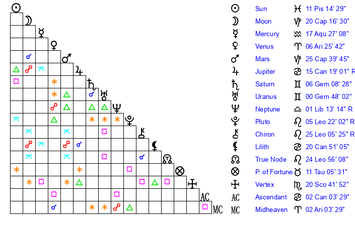 | Mars | 25 Capricorn 40 | 17 Cancer 17 | 27 Pisces 16 |