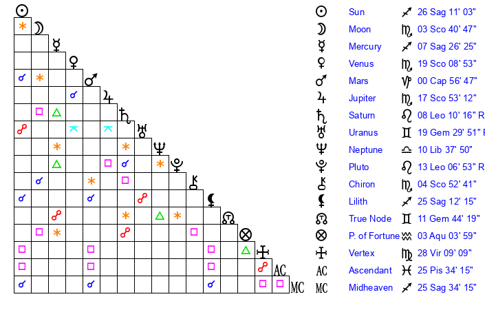 | Moon | 3 Scorpio 40 | 12 Sagittarius 4 | 23 Virgo 46 |