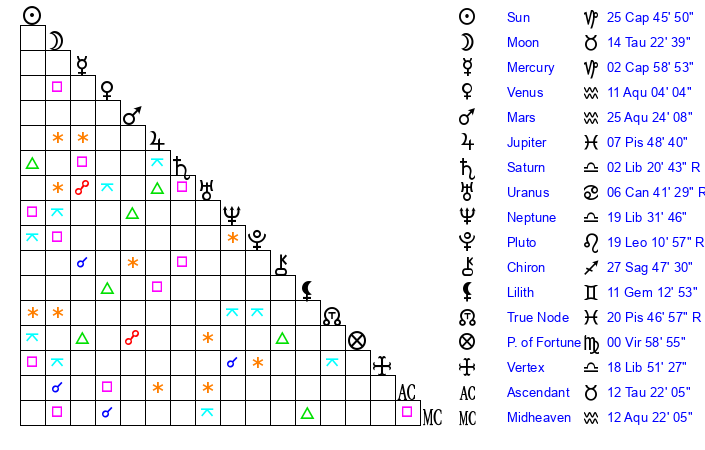 | Moon | 14 Taurus 22 | 0 Virgo 4 | 29 Capricorn 25 |